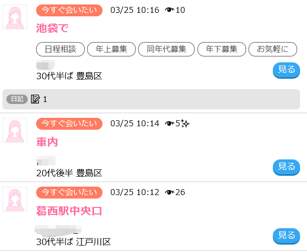 募集掲示板の「今すぐ会いたい」カテゴリには、毎日分単位で性欲強い女性が書き込みしてるから、場所、時間とかの条件さえ合えば、当日でも会えますよ。